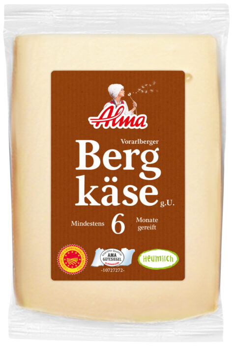 Der Alma Vorarlberger Bergkäse mit geschützter Ursprungsbezeichnung (g.U.) wird in kleinen Alma Bergsennereien auf über 600 m aus tagesfrischer Heumilch gesennt. Die 30-Kilo-Laibe reifen traditionell auf Fichtenbrettern im hauseigenen Reifekeller. Diese Spezialität bringt den unverfälschten Geschmack der alpinen Bergwelt auf den Teller und ist nach 6 Monaten mittel-kräftig im Geschmack.