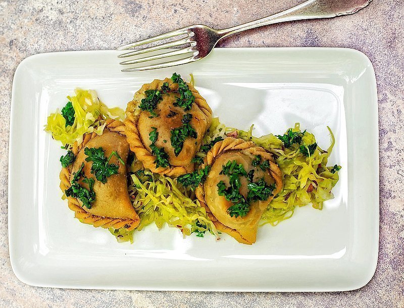 Für die Füllung die Schalotte schälen und würfeln. Dann in Butterschmalz goldgelb anschwitzen und mit Topfen und dem grob geriebenen Käse vermengen. Die gewaschenen Kartoffeln schälen und kochen, danach durch die Presse drücken, mit der Topfen-Käsemasse verrühren und mit dem fein geschnittenen Schnittlauch vermengen. Nach Belieben mit Muskat würzen. Den Teig dünn ausrollen, mit so viel Fülle wie möglich füllen und zu Taschen formen.