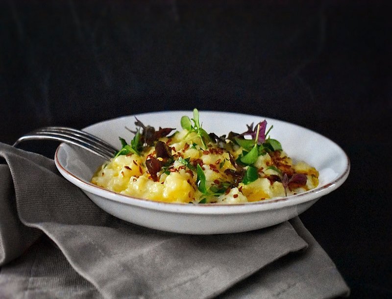 | 3 | Erdäpfel, Alma Vorarlberger Bergkäse g.U. und Petersilie dazugeben und gut vermengen. Anrichten und mit Leinöl, Leinsaat und Kresse servieren. |